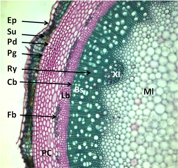 Coupe transversale dans une tige âgée de Sureau (Sambucus nigra, Adoxaceae), coloration carmin-vert d’iode, le carmin colore la cellulose en rose, le vert d’iode la lignine (et la subérine qui imprègne l’écorce) en bleu-vert ; Ml = moelle ou parenchyme médullaire, XI = xylème primaire, Bs = bois ou xylème secondaire, Ry = rayon du bois, Cb = cambium (ici bifacial), Lb = liber ou phloème secondaire, Fb = fibres périphloémiennes (sclérenchyme, qui ici remplace le phloème primaire qui est écrasé par le développement des tissus secondaires), PC = parenchyme cortical, Pd = phelloderme, Pg = phellogène, Su = suber, Ep = épiderme qui se desquame ; Phelloderme, phellogène et suber forment le périderme ou écorce. Le bois est constitué d’éléments dits verticaux (ou longitudinaux) qui sont les trachéides et/ou vaisseaux, des fibres et parfois du parenchyme vertical, et des éléments horizontaux, des rayons de parenchyme orientés radialement. Le tout est disposé radialement (le cambium produit des cellules alignées radialement) et est (normalement) lignifié.