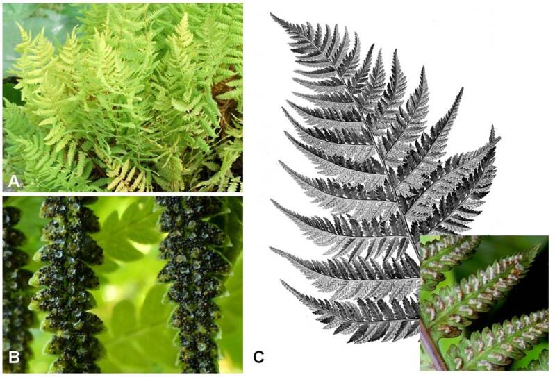 THELYPTERIDACEAE. A. Polystic des marais, Thelypteris palustris (Jardin des Plantes), B. T. palustris, détail des sores. WOODSIACEAE ou ATHYRIACEAE. C. Fougère femelle, Athyrium filix-femina, l’encadré en bas à droite représente les sores et les indusies.