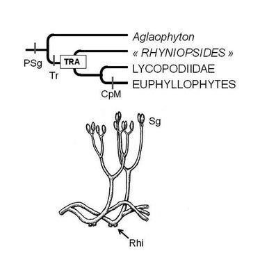 Relations évolutives au sein des Polysporangiophytes. TRA = Trachéophytes. Principales acquisitions : PSg = polysporangie, Tr = trachéides (et lignine), CpM = croissance pseudo-monopodiale. Le spécimen dessiné est Aglaophyton major, Polysporangiophyte éteint du Dévonien basal, Sg = sporanges, Rhi = rhizoïdes.
