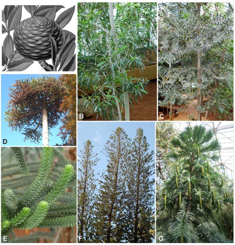 Désespoir du singe (Araucaria araucana), pin de Norfolk (Araucaria heterophylla), Agathis, pin de wollemi (Wollemia nobilis)