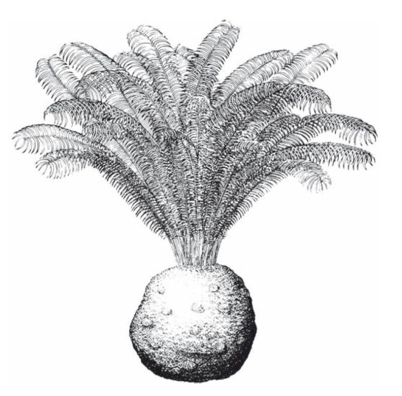 L'illustration de gauche montre la morphologie reconstituée de Cycadeoidea du Jurassique et du Crétacé, celle de droite les organes reproducteurs de Williamsoniella du Jurassique en coupe longitudinale.